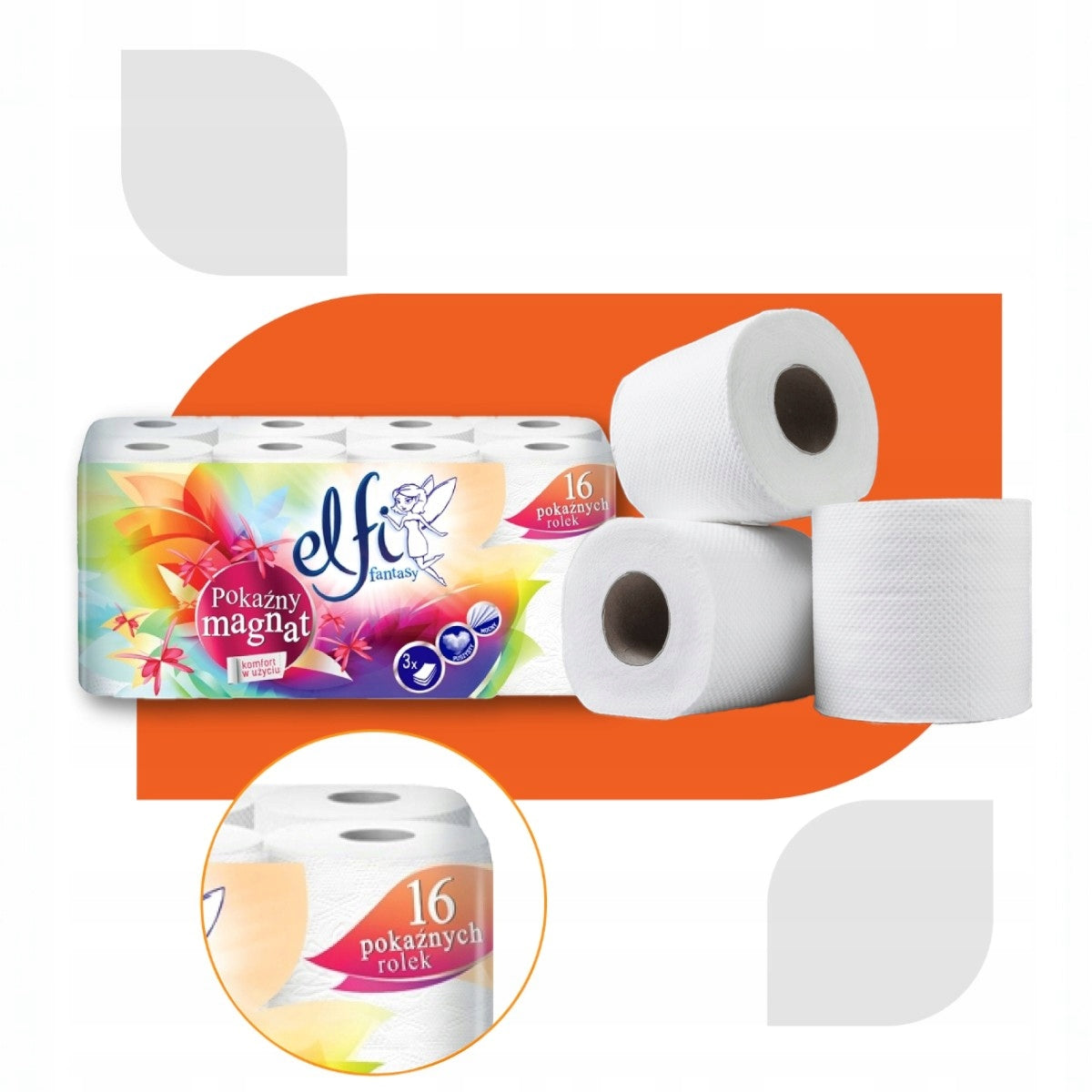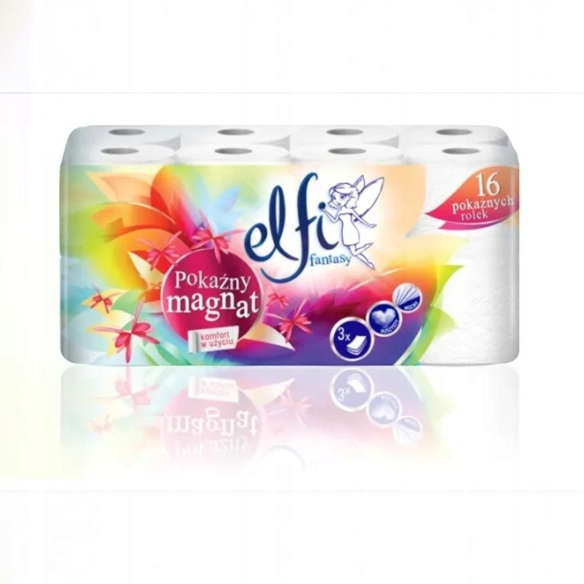 Toaletní papír ELFI Fantasy Pokaznany Magnat – pohodlí, hebkost a spolehlivost každý den! Až 16 rolí třívrstvého, zdobeného a přirozeně bílého papíru!