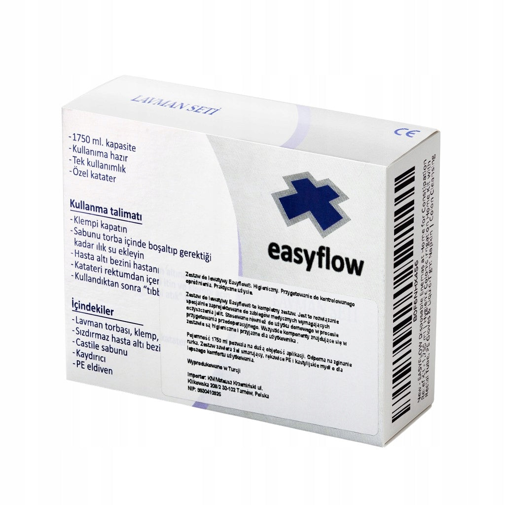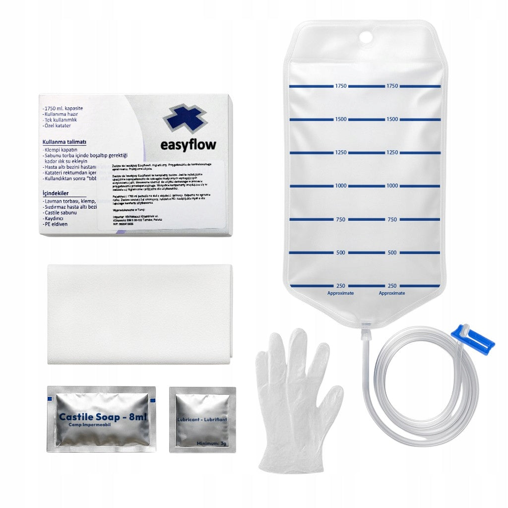 Zestaw do lewatywy EasyFlow to kompletny zestaw. Jest to rozwiązanie specjalnie zaprojektowane do zabiegów medycznych wymagających oczyszczania jelit. Stosowana również do użytku domowego w procesie przygotowania przedoperacyjnego. Wszystkie komponenty znajdujące się w zestawie są higieniczne i przyjazne dla użytkownika.