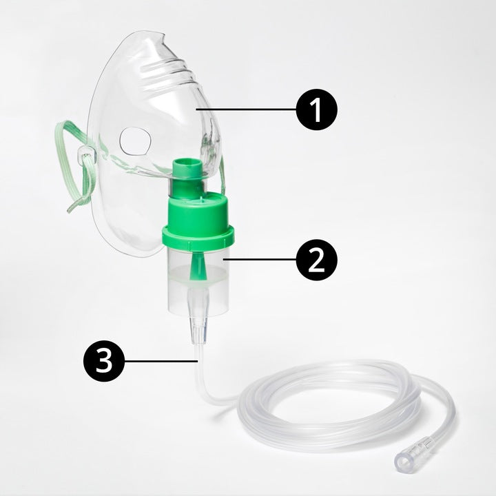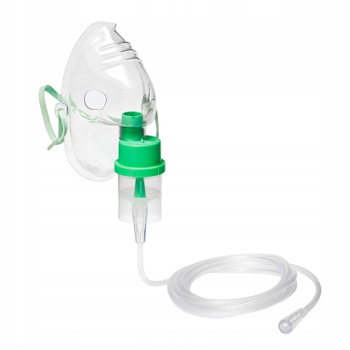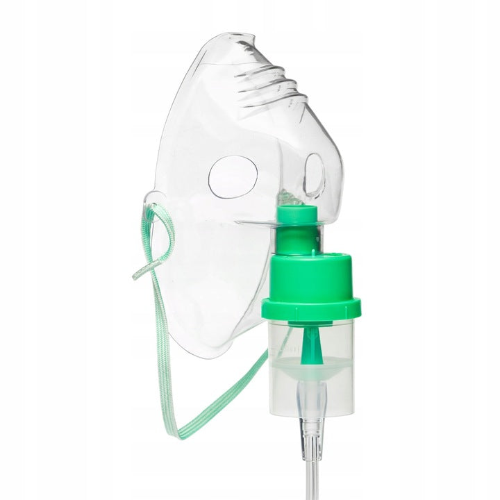Maska nebulizatora wykonana jest z medycznego PVC. Charakteryzuje się ergonomicznym kształtem dopasowyujacy się do konturów twarzy. Zapewnia jednorodną dystrybucję leków.