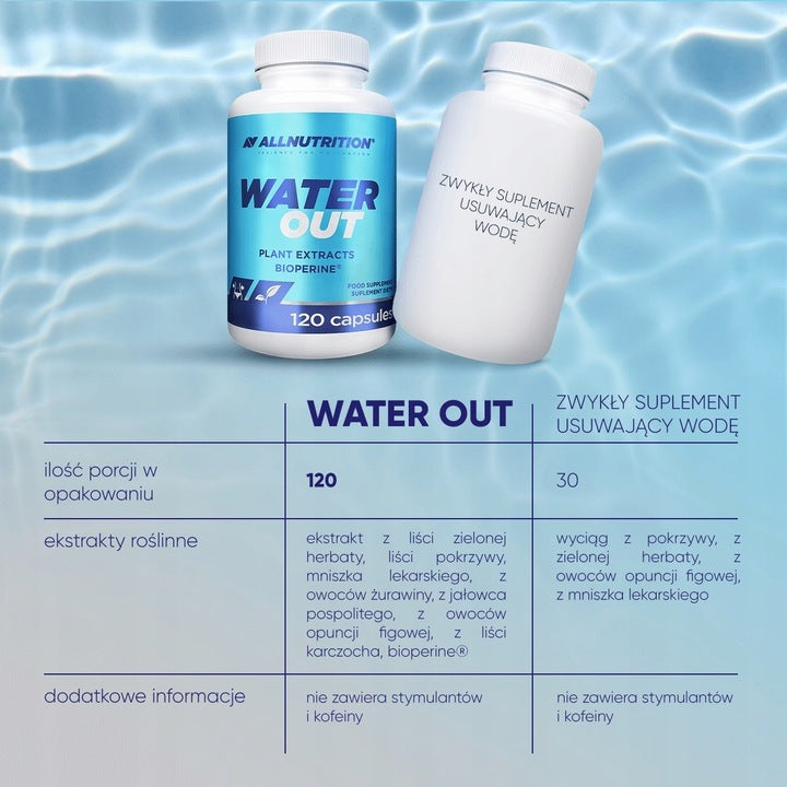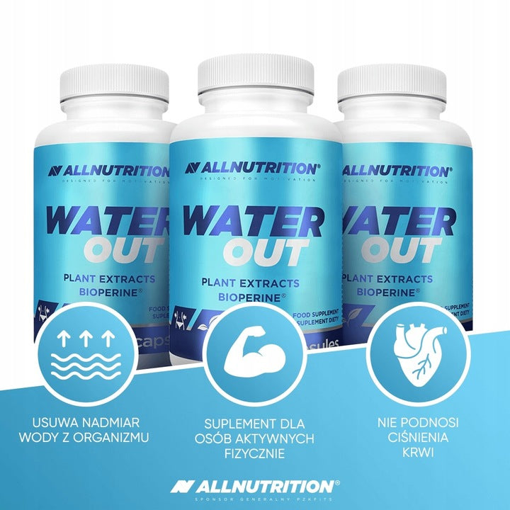 AllNutrition Water Out to specjalnie opracowana formuła dla osób, które zmagają się z nadmiarem wody w organizmie. To naturalny diuretyk wspomagający prawidłową pracę nerek oraz układu moczowego, dzięki czemu pomaga zmniejszyć obrzęki, poprawić sylwetkę i samopoczucie.