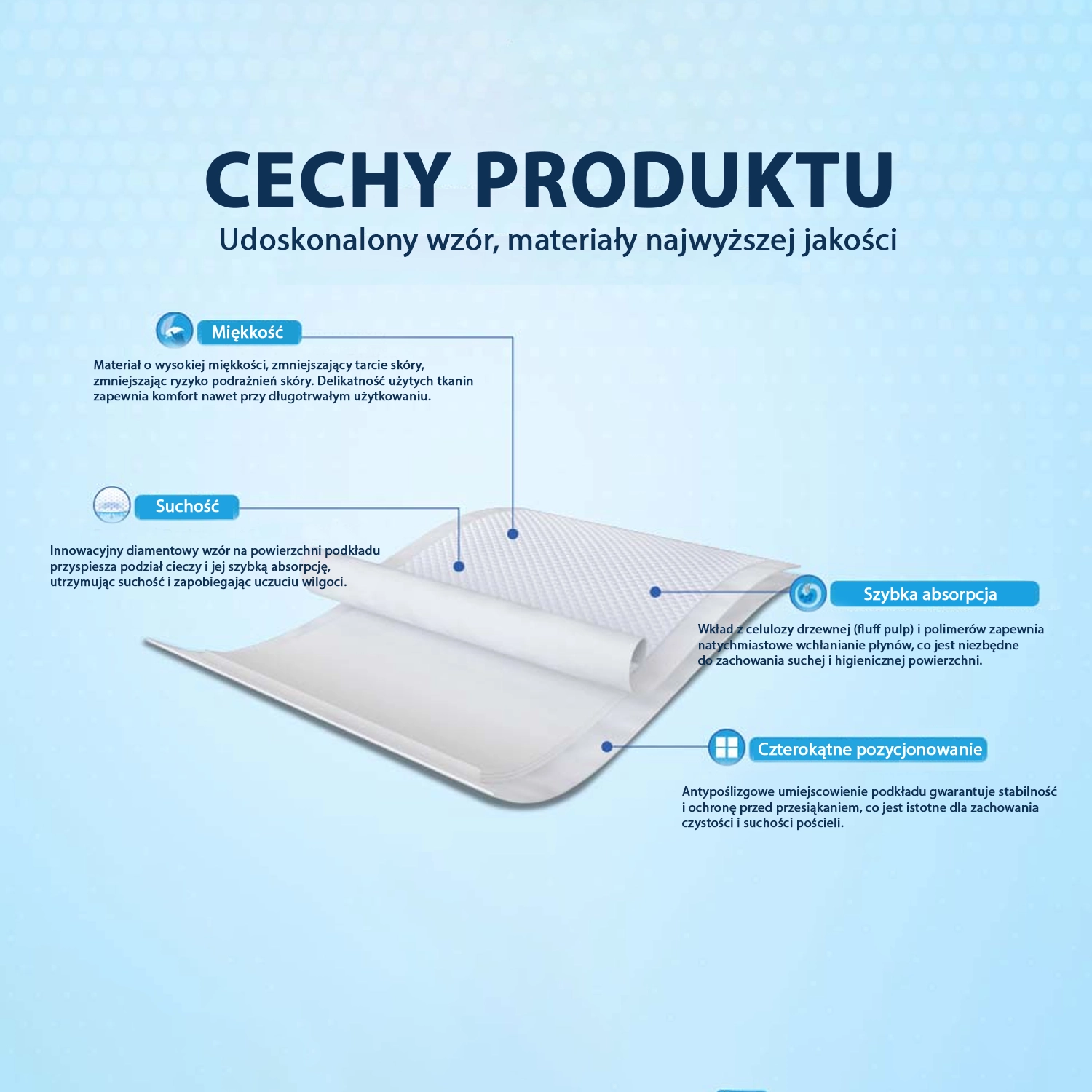 • Wkład z celulozy drzewnej (fluff pulp) i polimerów zapewnia natychmiastowe wchłanianie płynów, co jest niezbędne do zachowania suchej i higienicznej powierzchni.