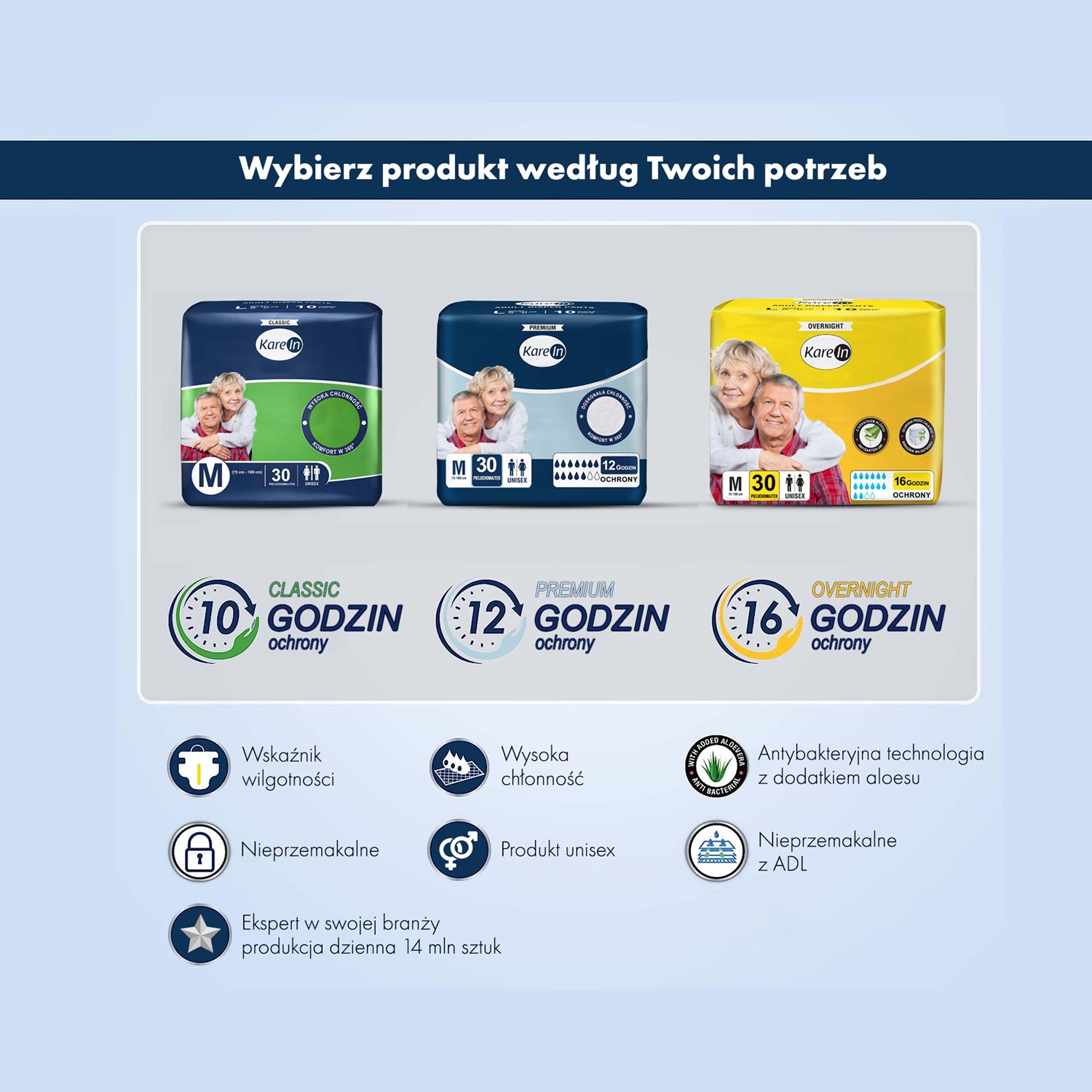 - Dopasowanie do potrzeb: Rozbudowany wybór modeli, od Classic zapewniających ochronę przez 10 godzin, przez Premium do 12 godzin, aż po Overnight gwarantujące suchość do 16 godzin.
