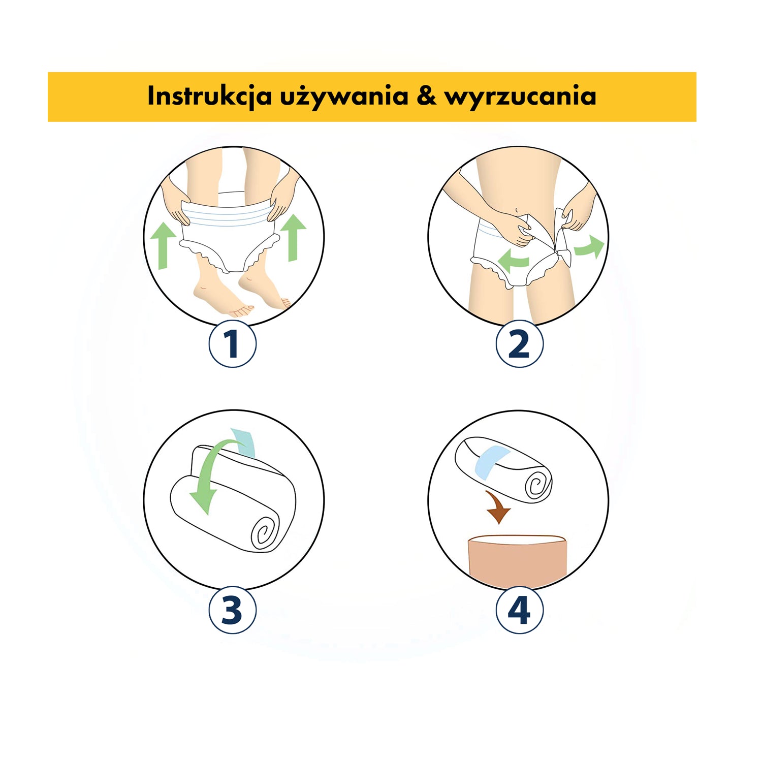 3. Składanie. Po zużyciu, zwiń zużyte pieluchomajtki. Zaklej po zwinięciu dzięki