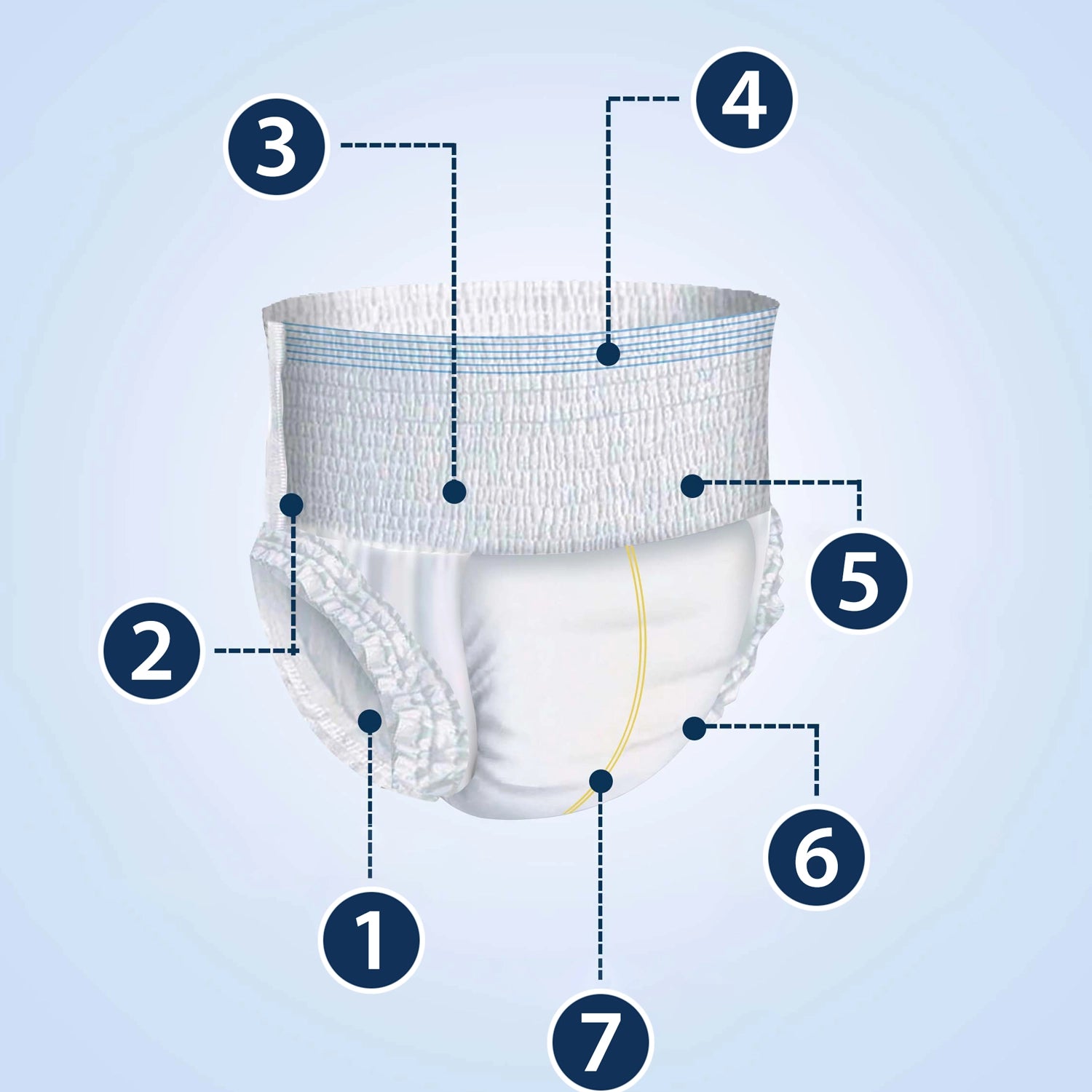 Super absorbentny rdzeń żelowy skutecznie zamyka płyny i pomaga eliminować nieprzyjemne zapachy, a kolorowy pas w talii wskazuje przednią część pieluchomajtek, ułatwiając ich zakładanie. Mankiety na nogach zapewniają dobrze dopasowany i bezpieczny krój, zapewniając ochronę przed przeciekaniem.
