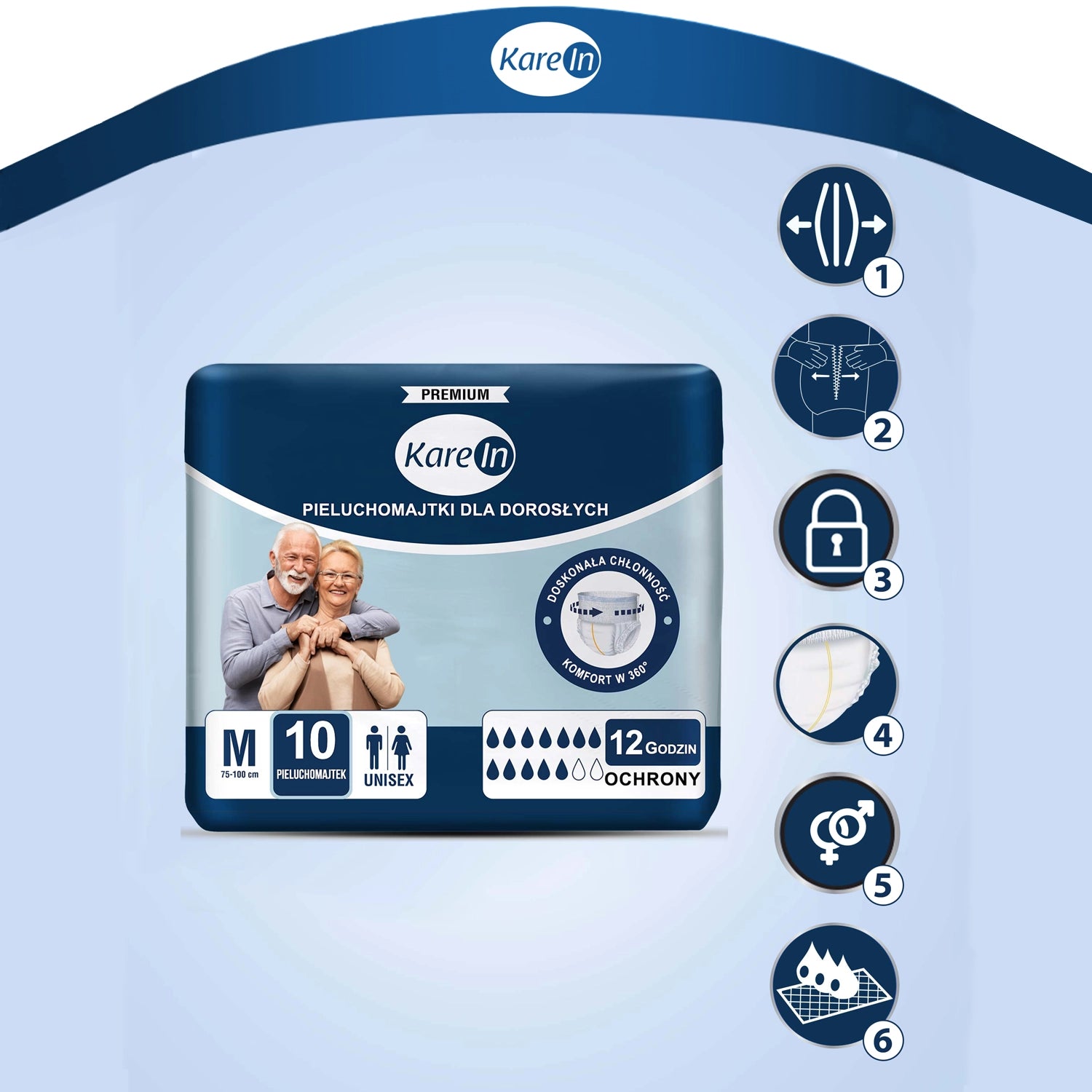 5. Dopasowanie i ochrona: Pieluchomajtki KareIn Premium łączą w sobie cienką konstrukcję z miękkim bawełnianym przylegającym pasem, który zapewnia dyskrecję, wygodę oraz komfort użytkowania.