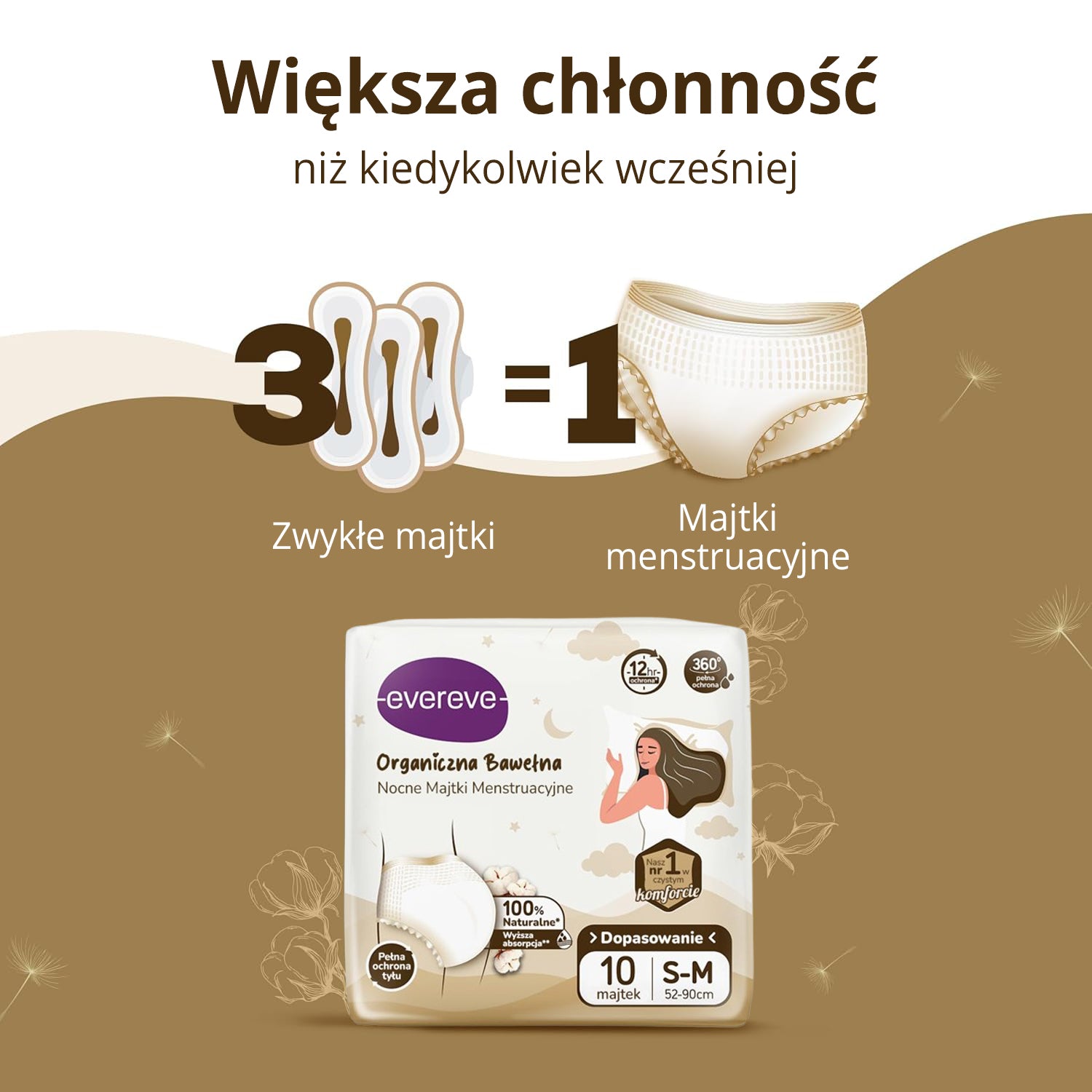 Majtki są super-chłonne, technologia pozwala na blokowanie nadmiaru płynu. Pozwalają na wchłanianie o pojemności do 3 razy większej niż w przypadku tradycyjnych podpasek. Majtki chłonne Evereve mają komfortowe dopasowanie, łącząc zalety zwykłych majtek i podpaski w jednym produkcie.